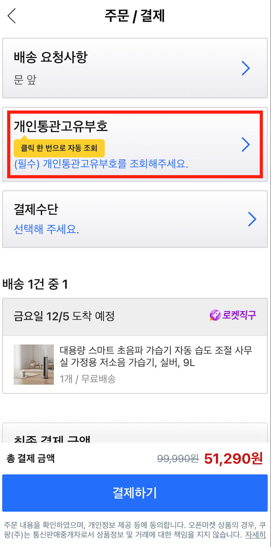- 주문 결제 화면에서 "개인통관고유부호" 입력란 확인