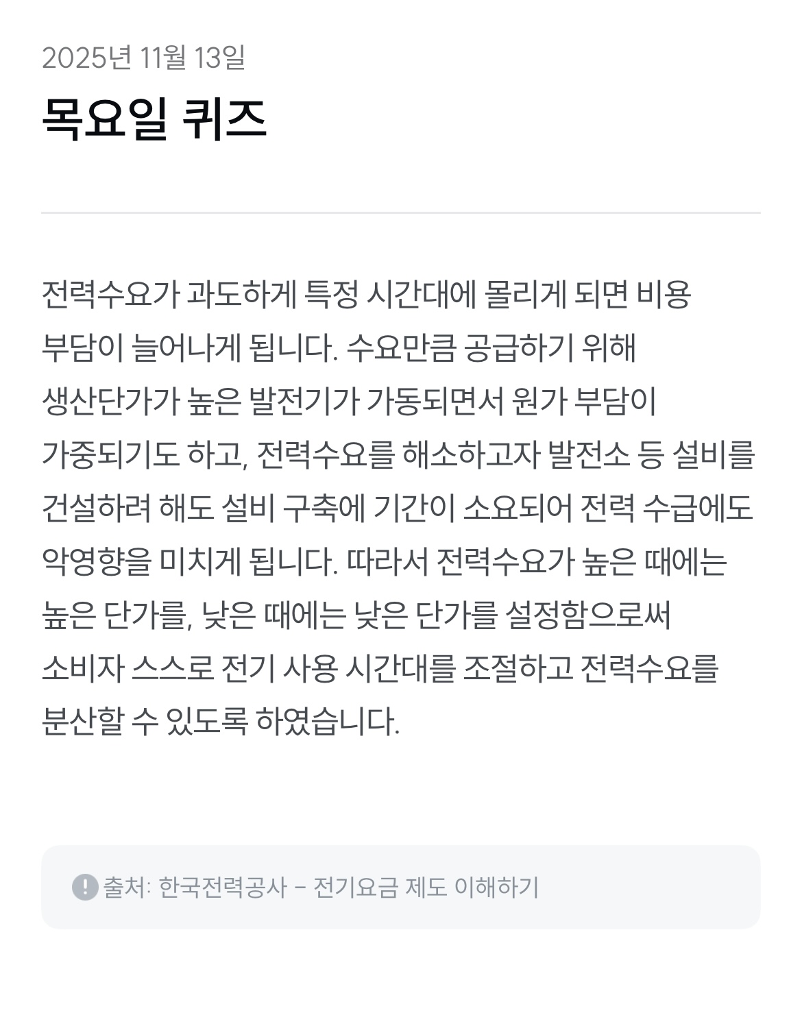 2025년 11월 13일 기후동행퀴즈 정답은? '전기를 많이 사용하는 시간대에 전기요금이 더 비싸질 수 있다'는 사실을 알아보고, 기후실천과 리워드 적립까지 챙기는 정보를 확인하세요.