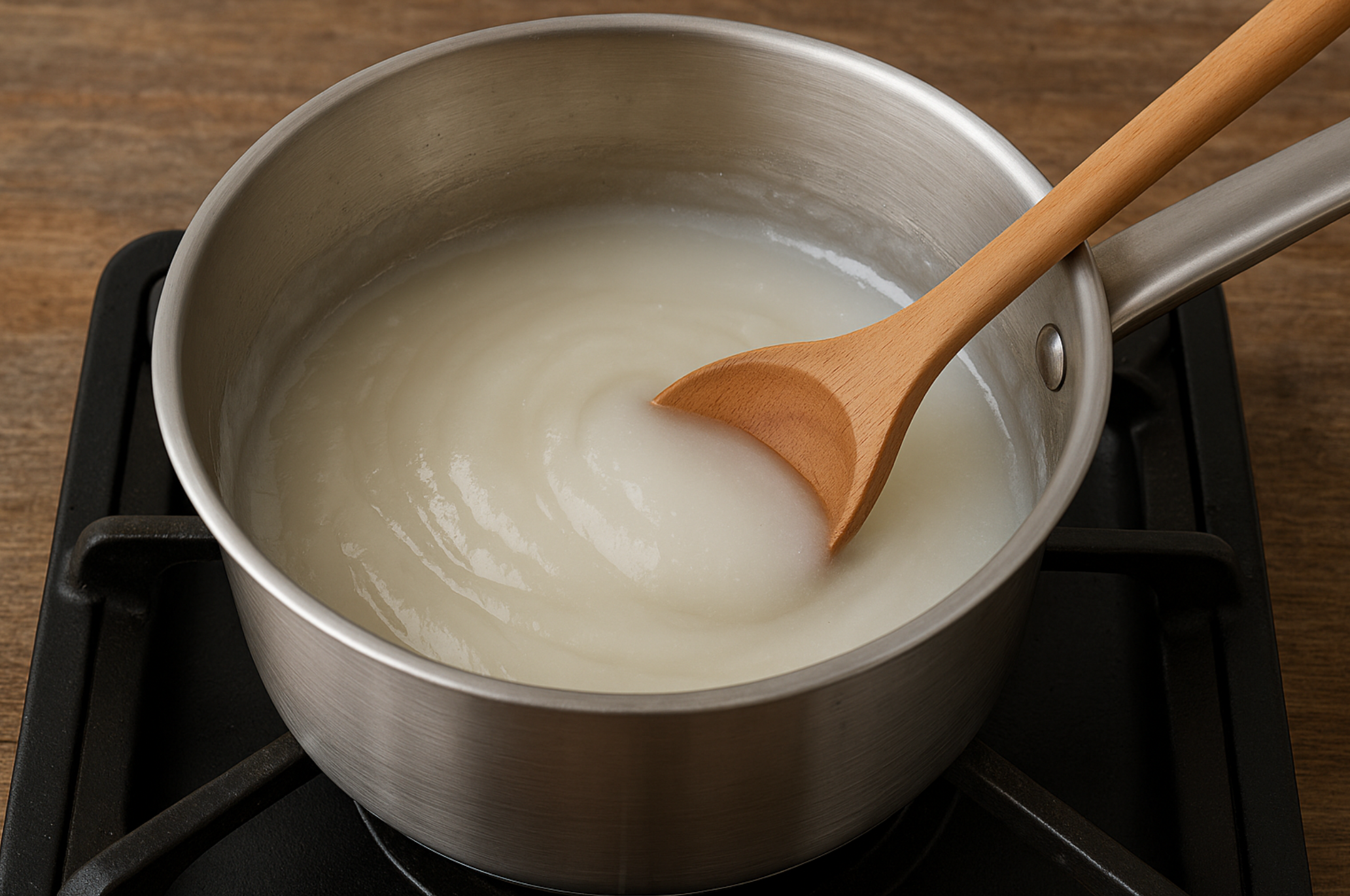 - 냄비에 물 3컵 + 찹쌀가루 3큰술 넣고 중불에서 저으며 끓입니다.