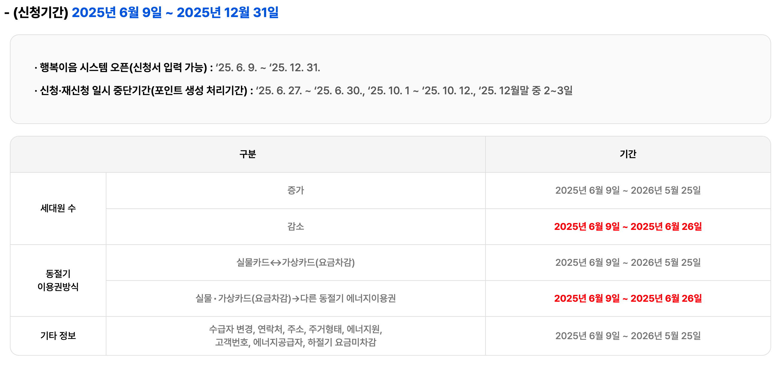 - 사용기간: 하절기·동절기로 나누어 지원금 사용 가능 기간이 설정되어 있습니다.
