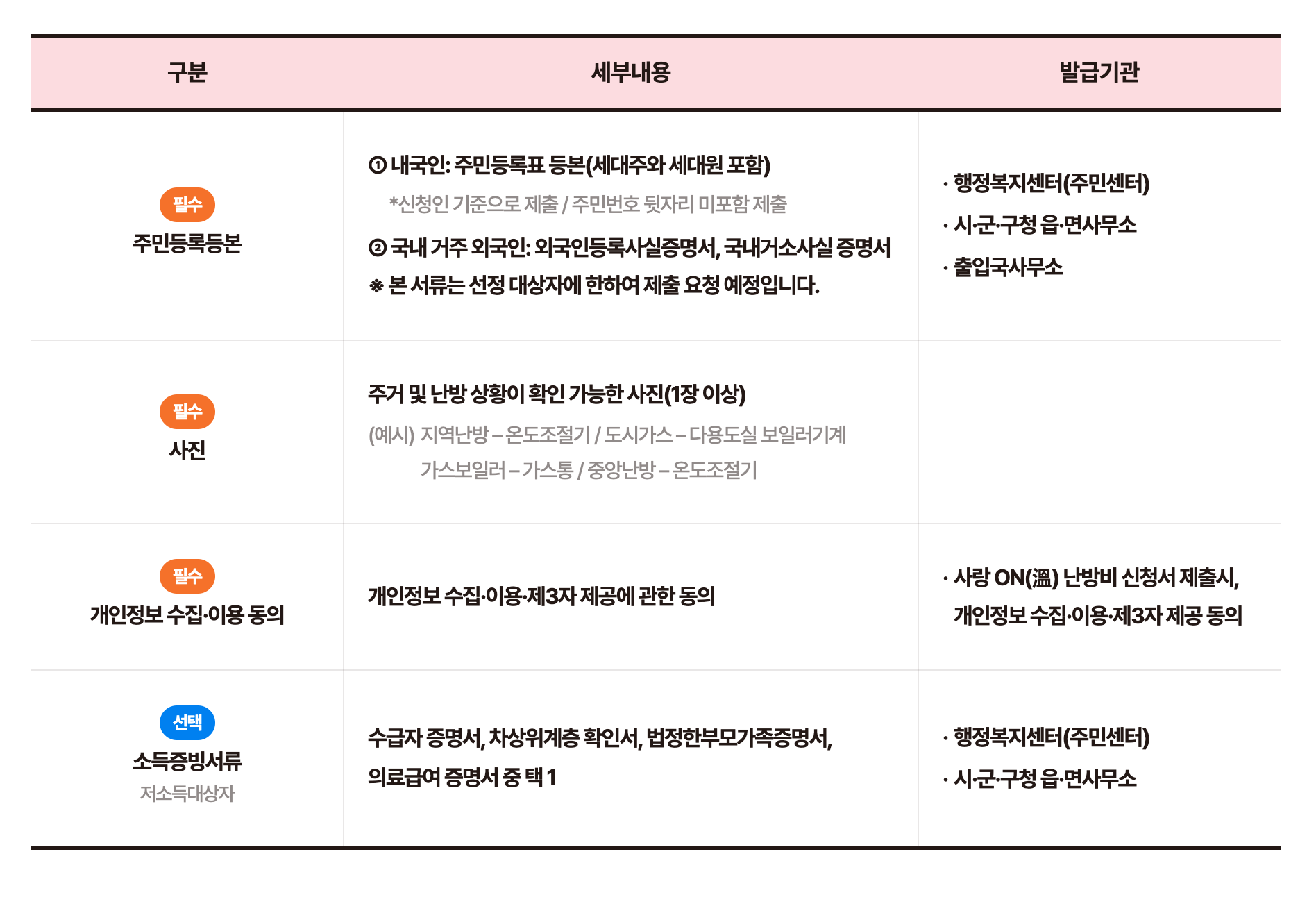 - 필수 서류 등록: 난방요금 고지서, 세대원 정보, 주거 형태 자료 등