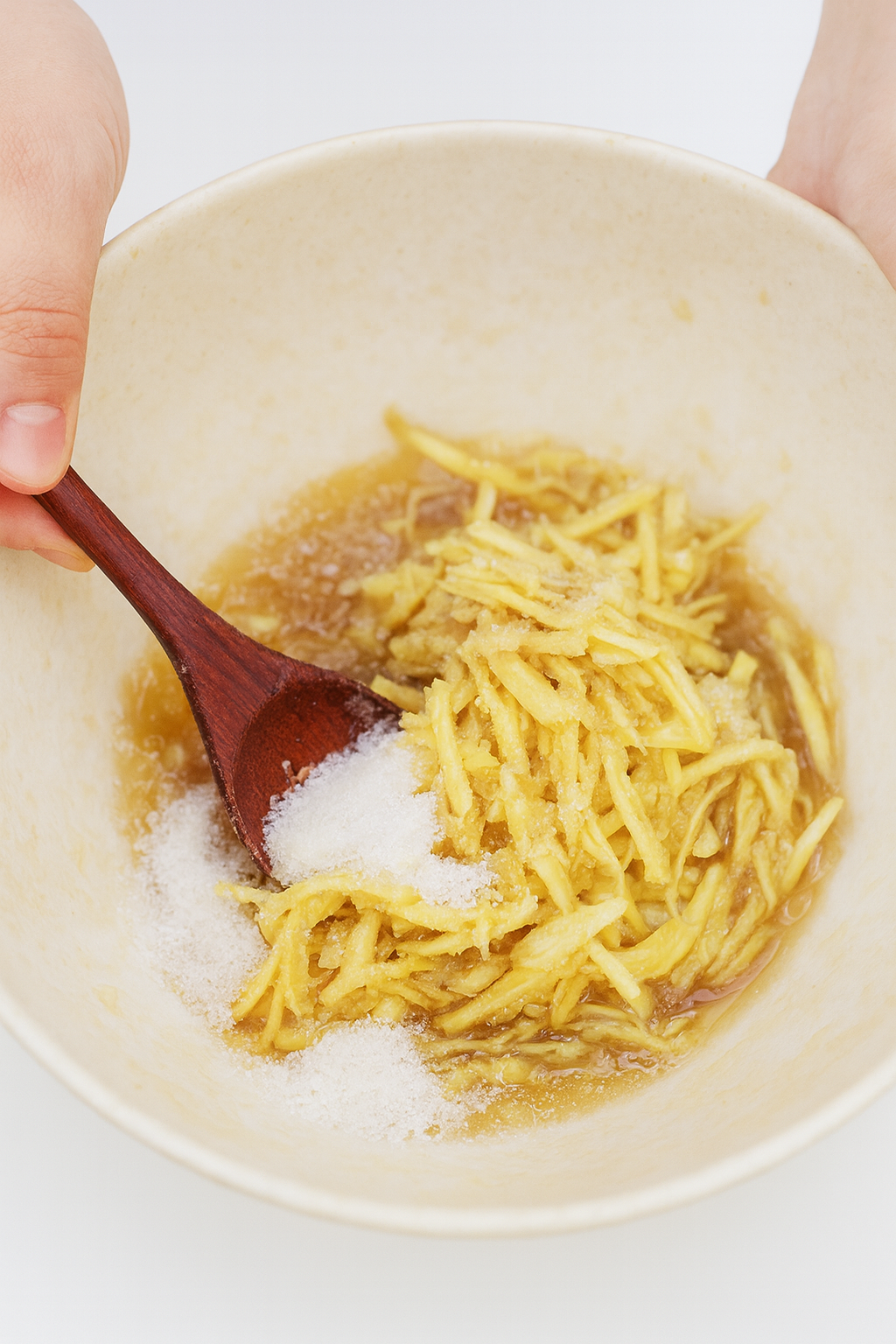 - 재료 예시: 생강 1 kg (껍질 제거 후) + 백설탕 1 kg + 꿀 3큰술 (선택)