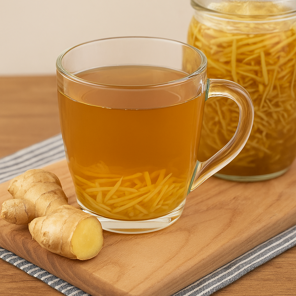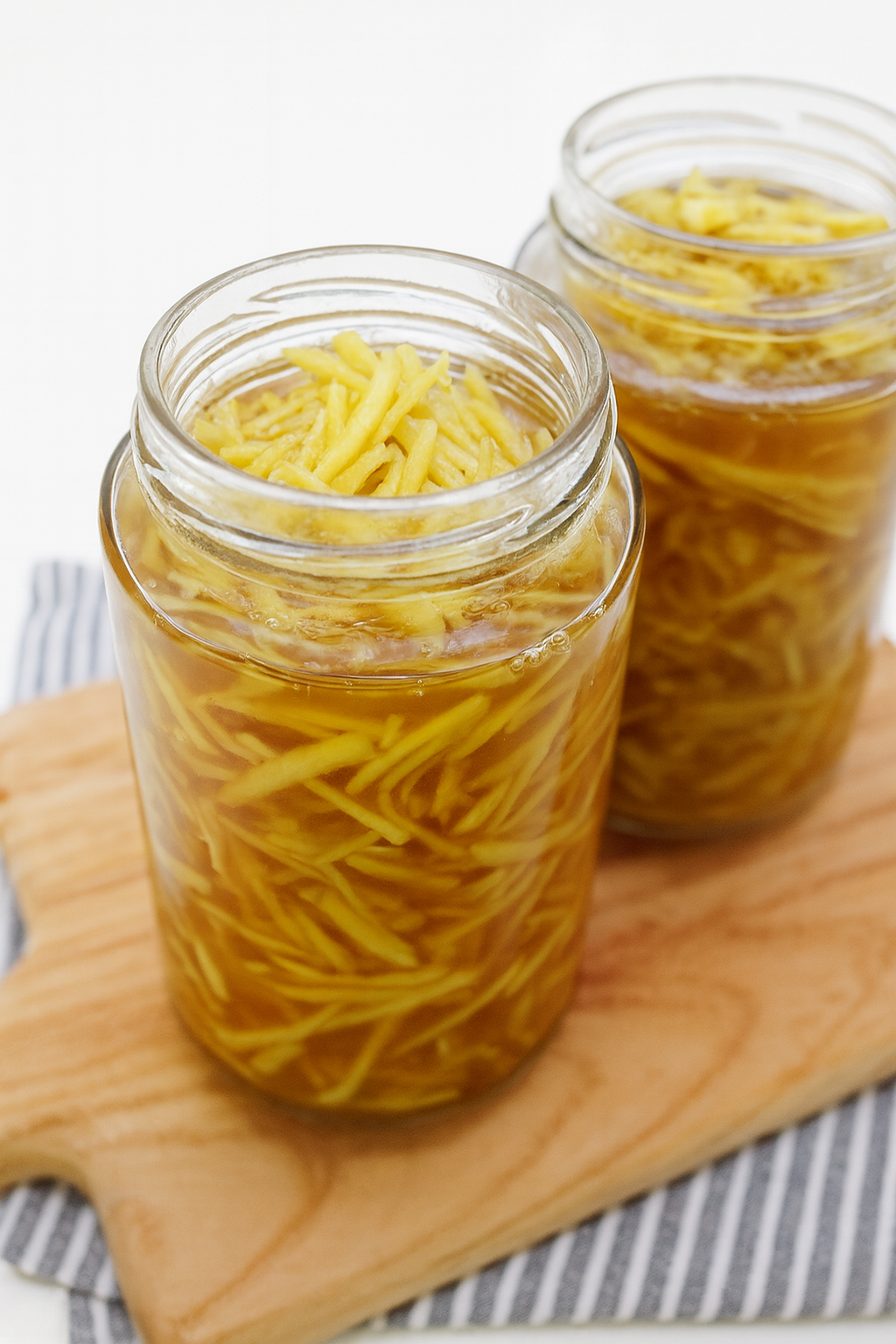 - 숙성이 끝난 후에는 체로 걸러 맑은 액체만 유리병에 담아 냉장보관하면 완성입니다. 남은 생강 조각은 버리지 않고 차로 활용해도 좋아요.