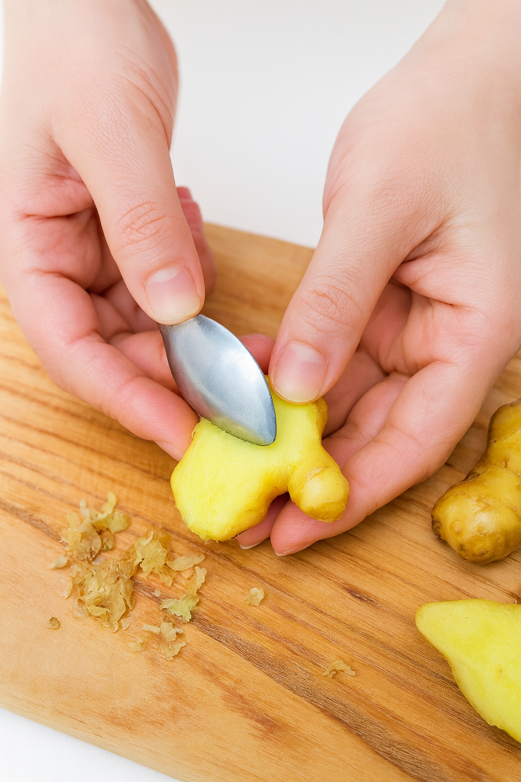 - 껍질 제거는 칼보다 얇은 숟가락으로 긁어내는 방식이 생강 살을 덜 손상시키기 좋습니다.