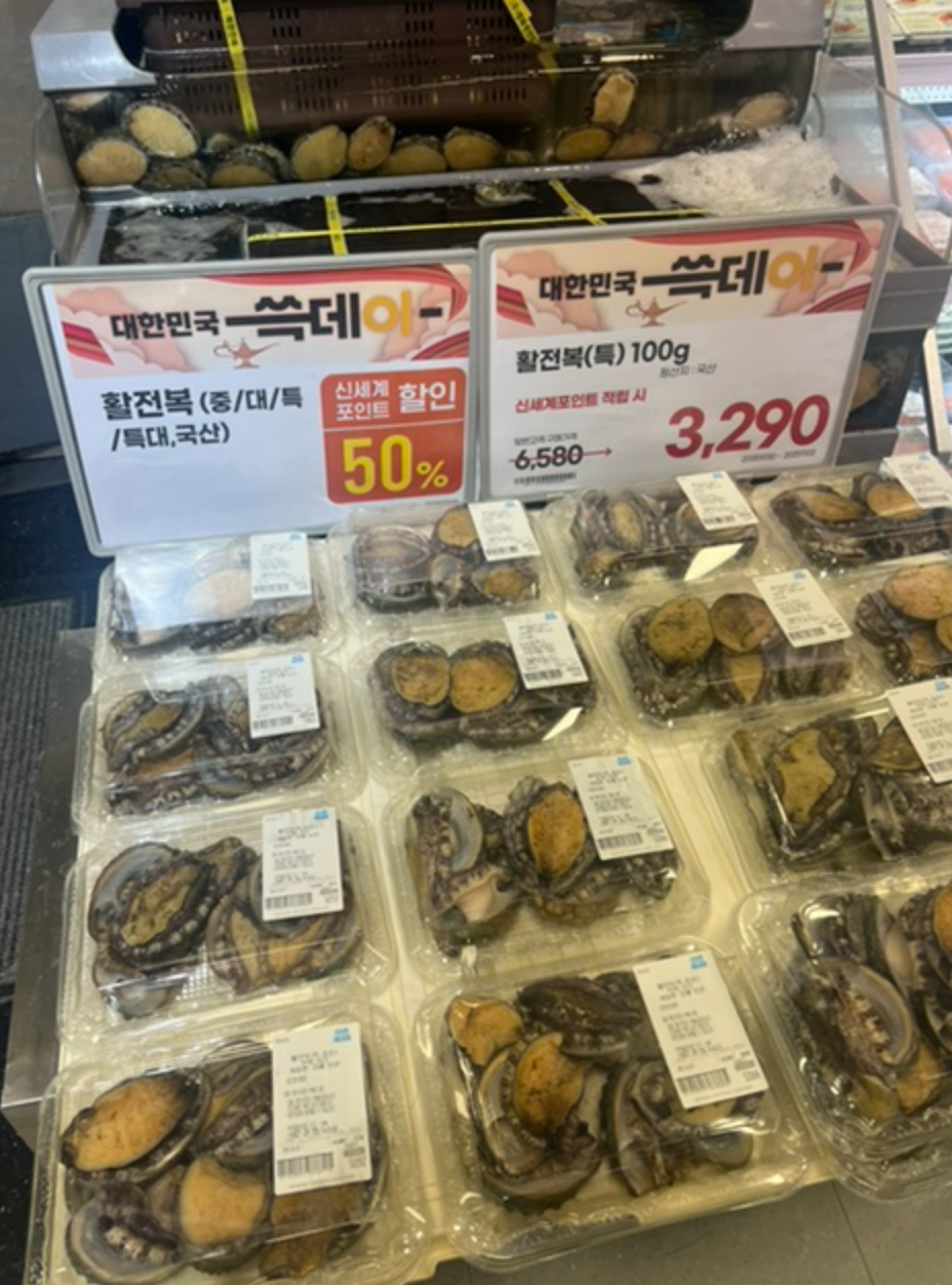 - 활전복 50% 할인 → 100g 3,290원
