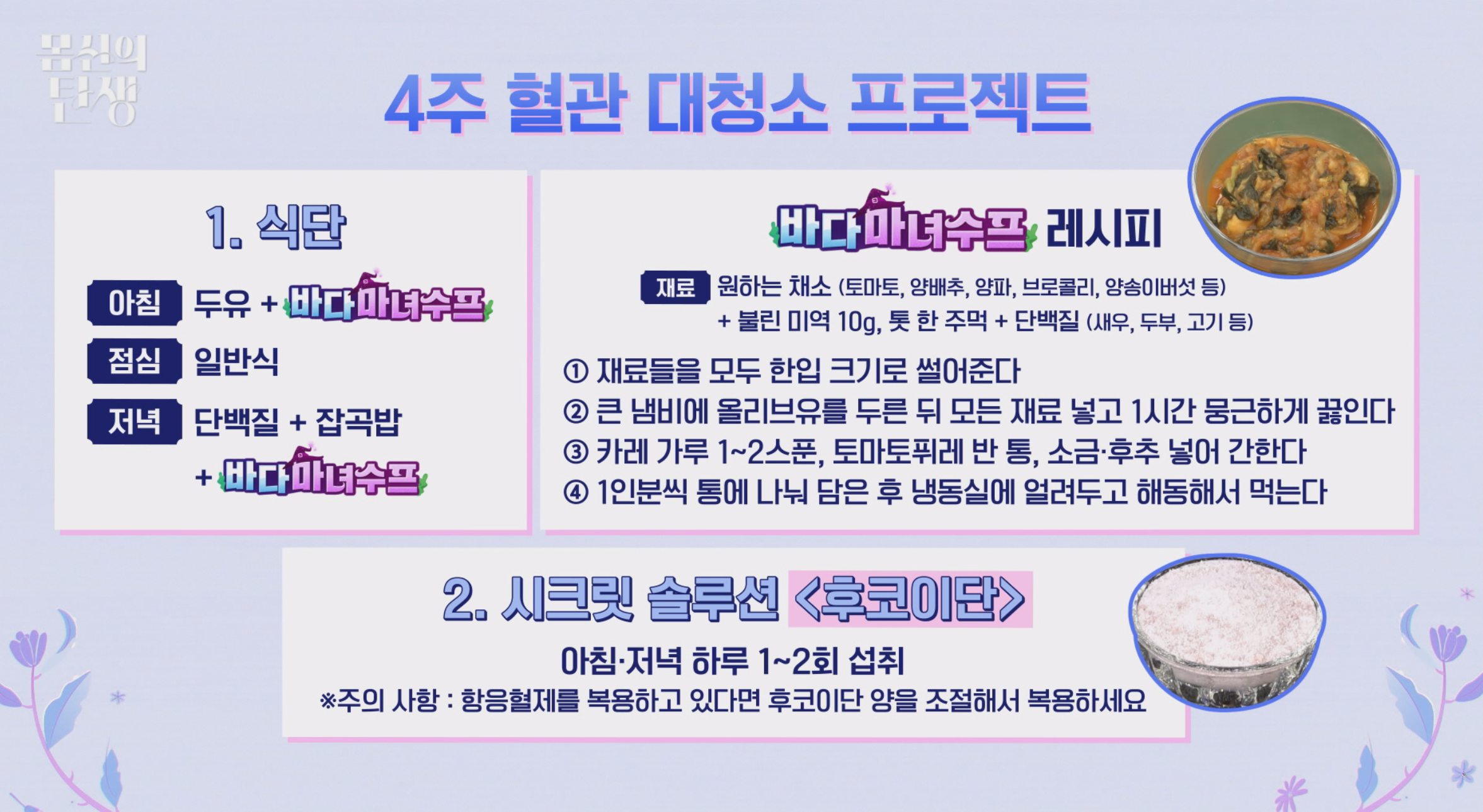 - 59회 주요 내용: 커피 중심의 불규칙한 식습관으로 인해 혈관 내 플라크가 쌓이고, 영양실조와 혈관 노화가 진행 중인 출연자가 등장 — 이를 계기로 ‘혈관 플라크 대청소’ 프로젝트가 시작되었습니다. 기존의 ‘마녀수프’ 레시피를 업그레이드한 해조류 포함 ‘바다마녀스프’와, 혈관 건강을 위한 성분 ‘후코이단’이 시크릿 솔루션으로 제안되었습니다.