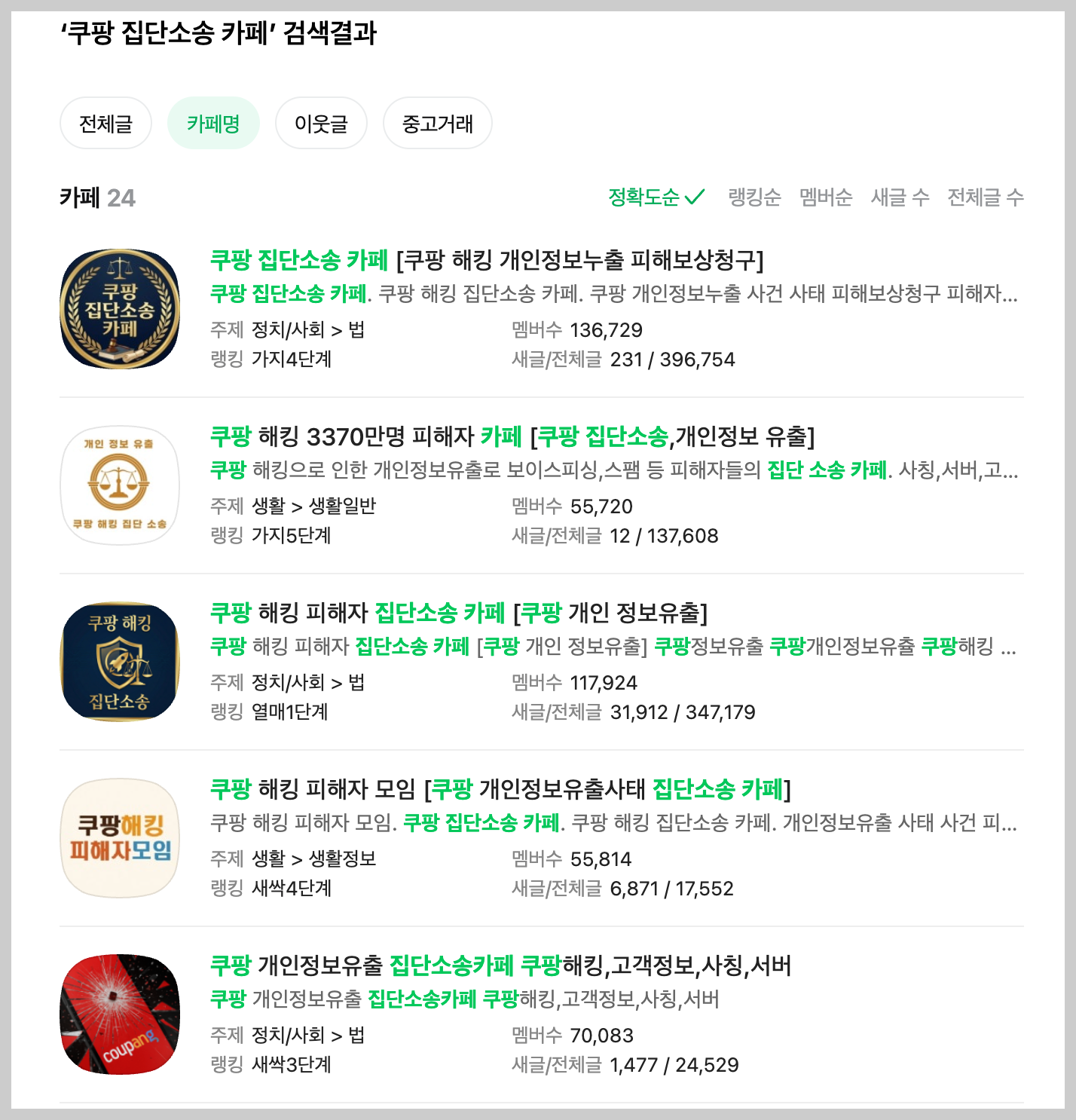 네이버에서 ‘쿠팡 집단소송 카페’ 검색