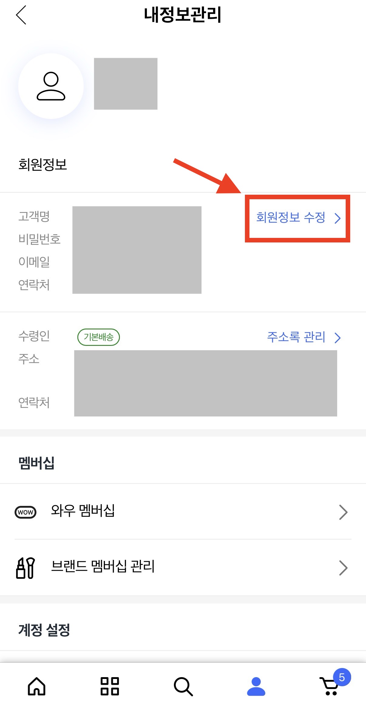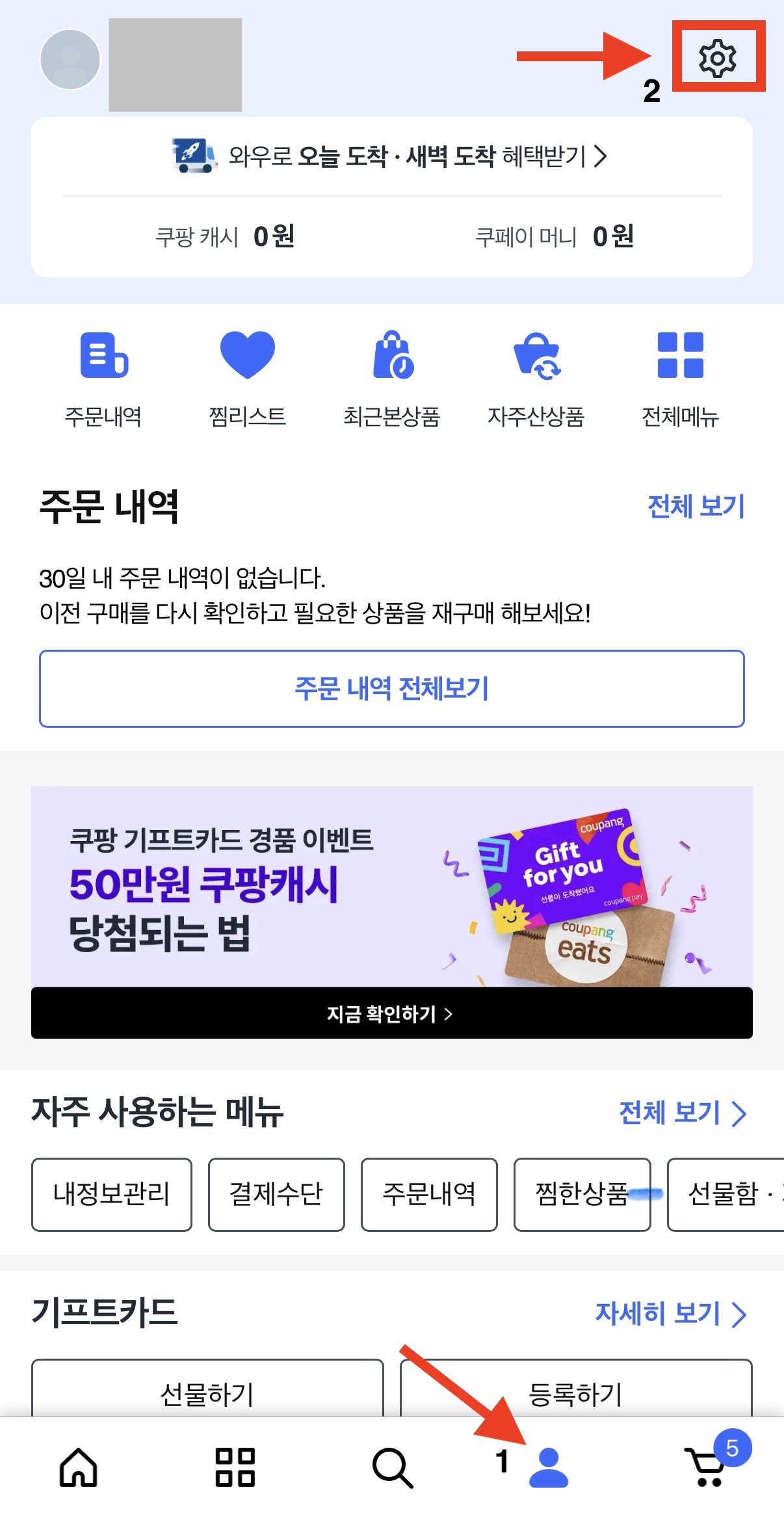 - 마이쿠팡 → 내정보관리(톱니바퀴 모양)