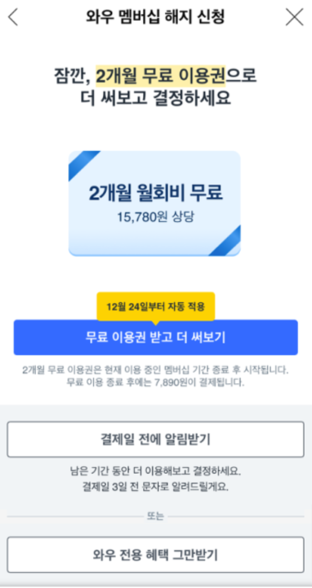 - “2개월 무료 이용권 드립니다” 메시지 → 와우 전용 혜택 그만받기 선택 후 다음 단계 진행