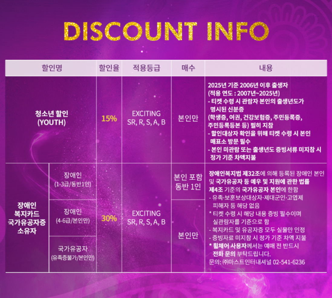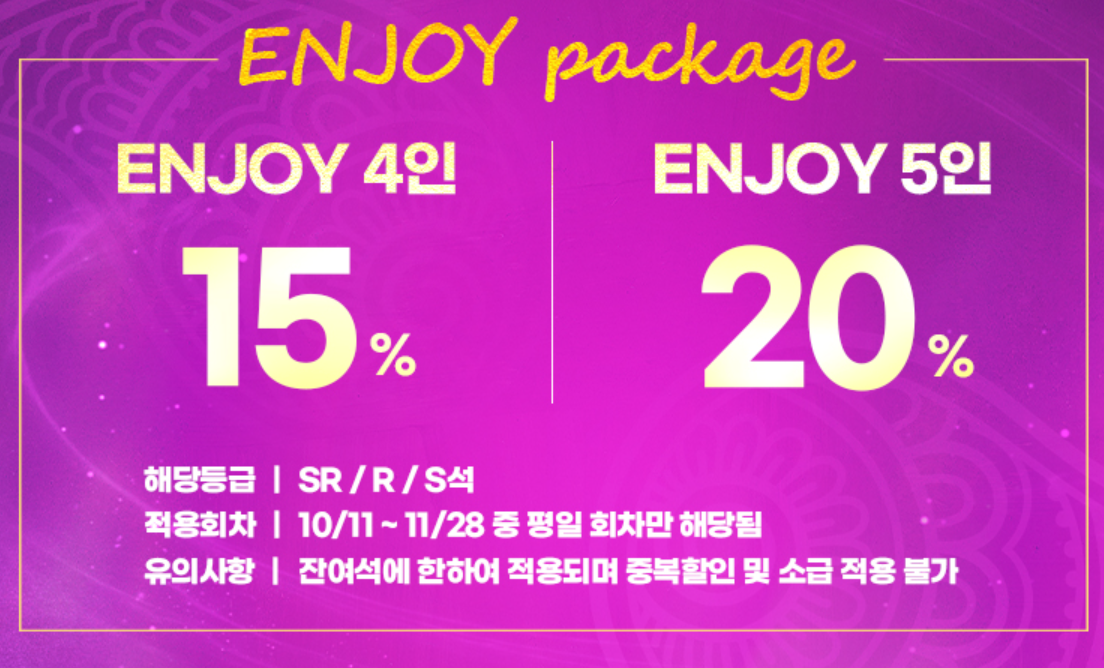 | SR석, R석, S석 | 4인 예매 시 15%, 5인 예매 시 20% | 11월 28일까지 예매 시 |