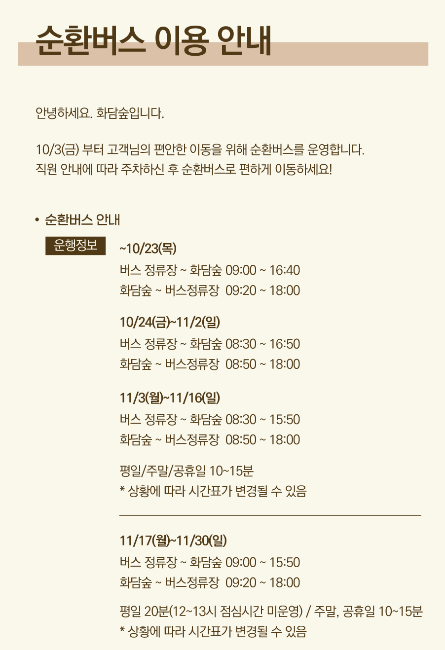 - 곤지암역 1번 출구 앞 ↔ 화담숲 (약 15분 소요)