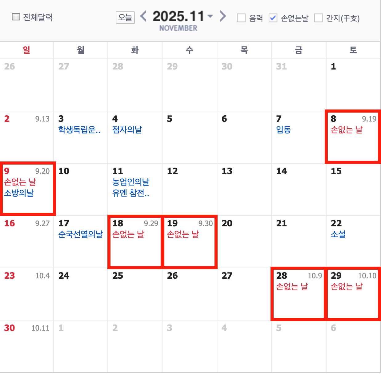 2025년 11월 손없는날은 아래와 같이 정리되어 있습니다.