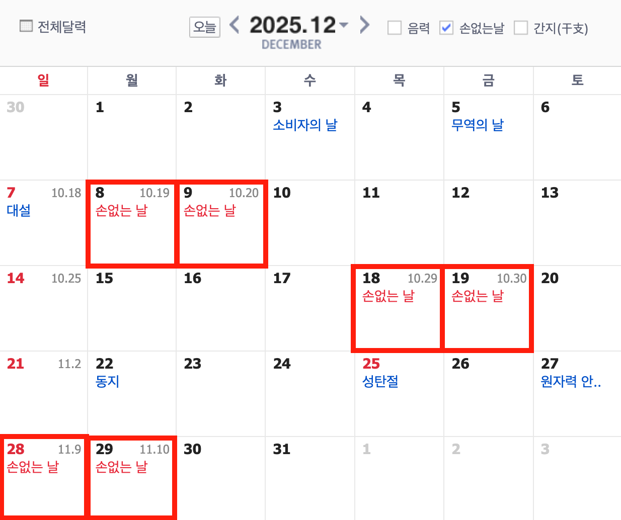 2025년 12월의 손 없는 날은 다음과 같습니다.